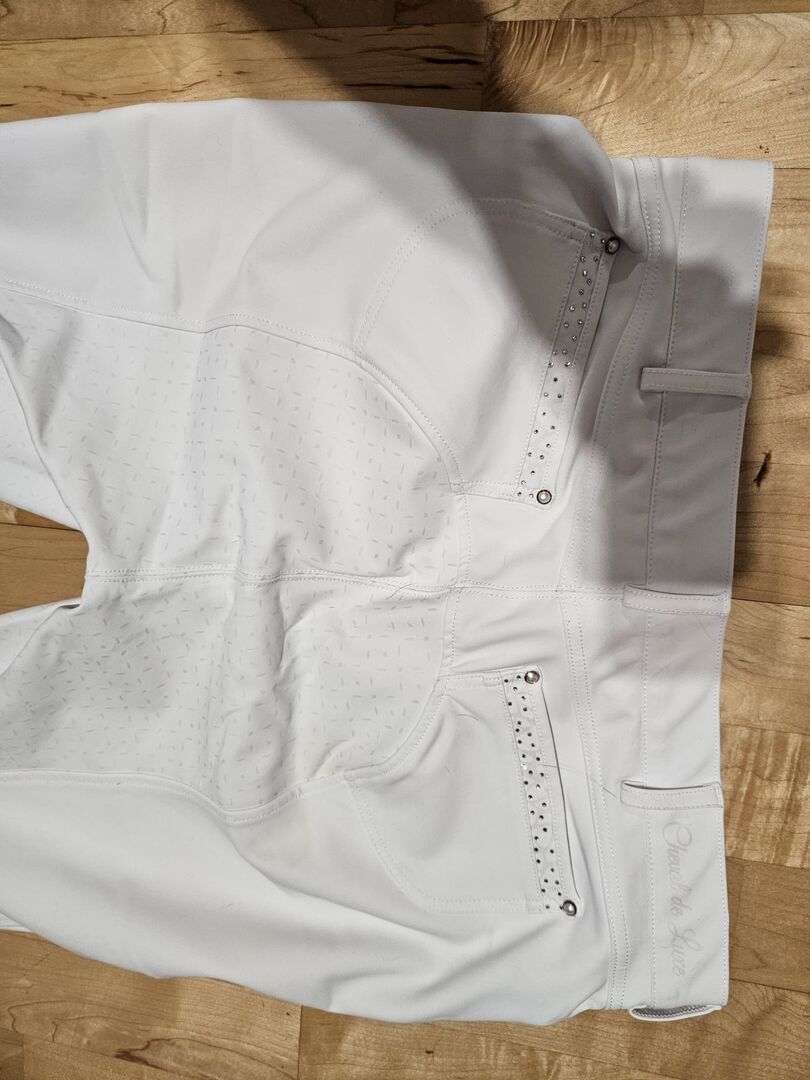 Wijze toernooibroek - Ik verkoop een witte rijbroek in 44 met grip, glitters op de achterkant en alle steentjes zitten er nog in. Niet uitgewassen en geen vlekken of andere tekenen van slijtage, ze zitten heel comfortabel op het lichaam.