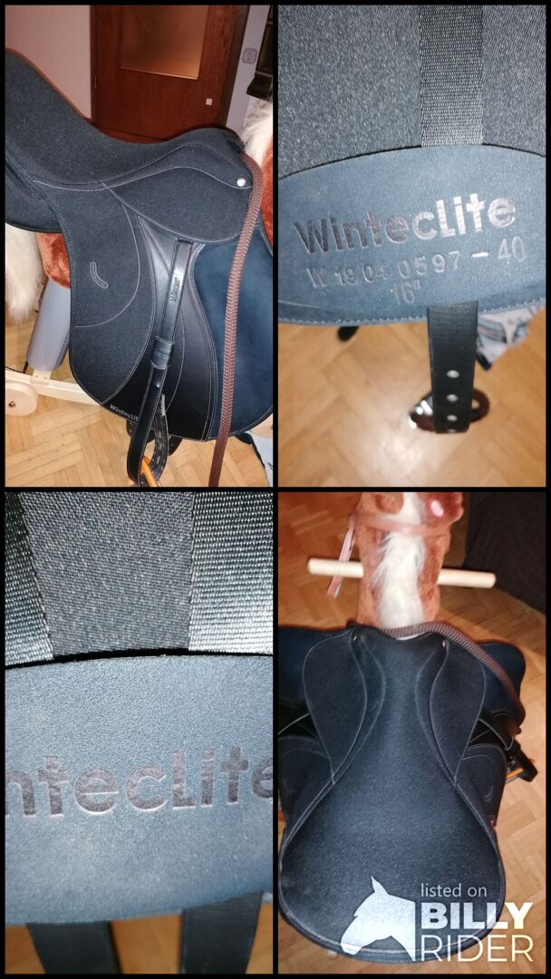 Wintec lite 16" met cair - Het zadel zat er alleen op om er aan te wennen, dus er heeft geen ruiter op gezeten, alleen onze dochter van 2 jaar op het hobbelpaard. Er zit een zwarte slokdarmplaat in.