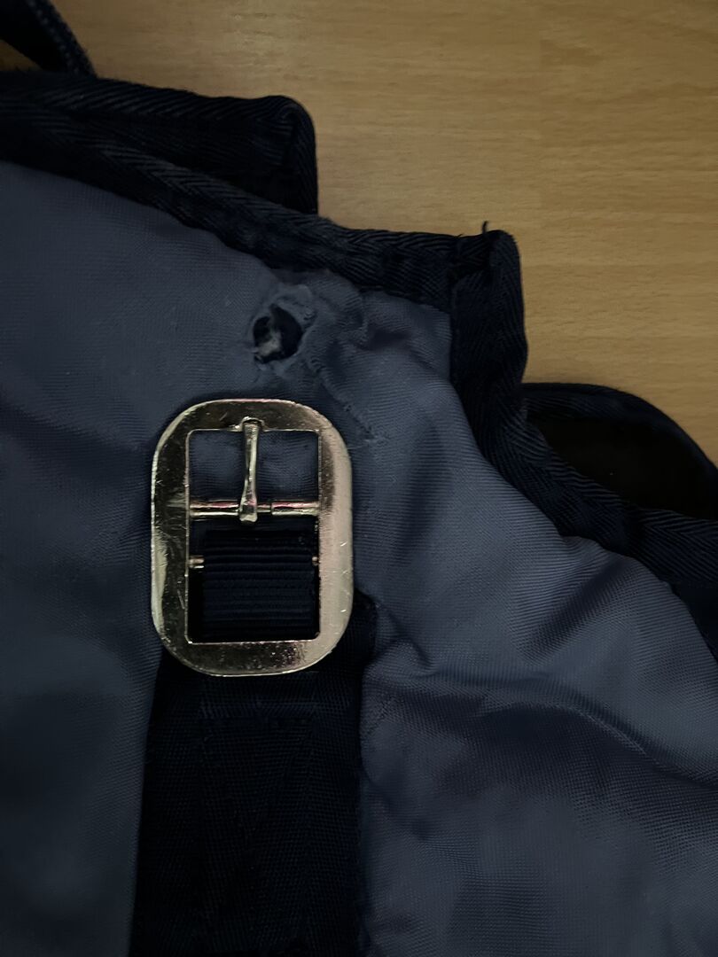 De deken vertoont lichte sporen van slijtage. Een klein gaatje aan de voorkant onder de gespen (zie foto).