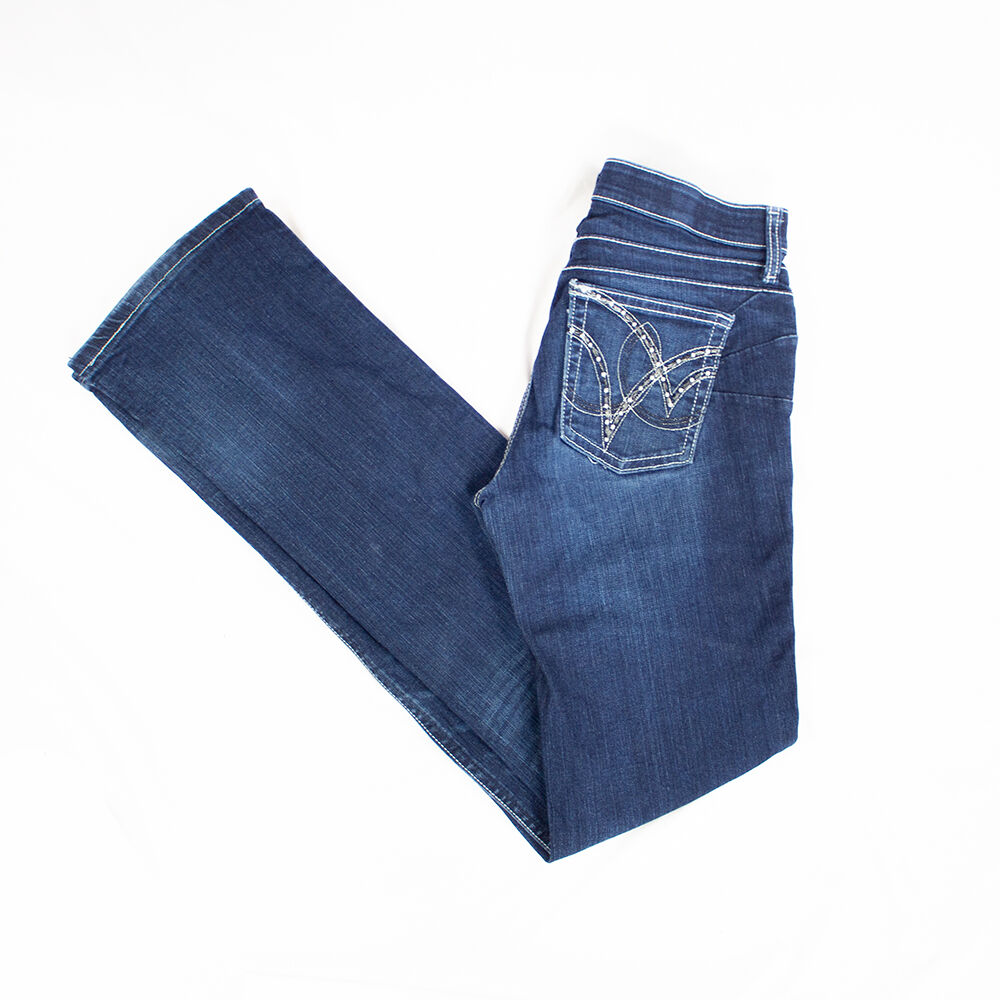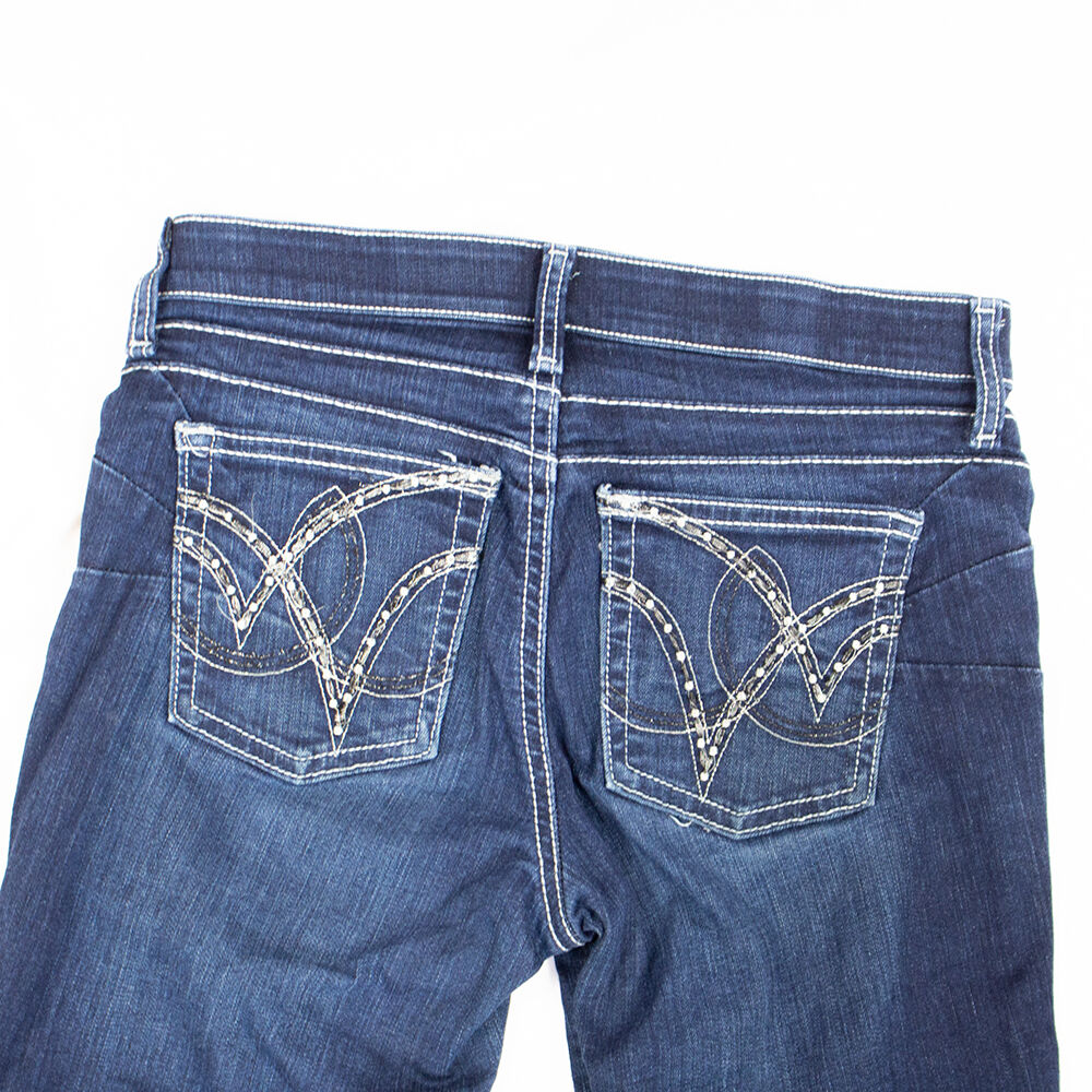 Wrangler Q-Baby Dames Rijbroek Donkerblauw 3/4 X 34 - De perfecte jeans voor het rijden komt waarschijnlijk van Wrangler Q-Baby. De donkerblauwe jeans heeft beige contraststiksels en een prachtig glitterborduursel op de achterzakken. De elastische tailleband voorkomt afzakken en zorgt voor een perfecte pasvorm van de broek. Ze hebben een US jeans maat van 3/4 X 34. De maat 3/4 geeft de breedte aan en de 34 de binnenbeenlengte. De broek is in zeer goede staat. To the seller's offerlaunch