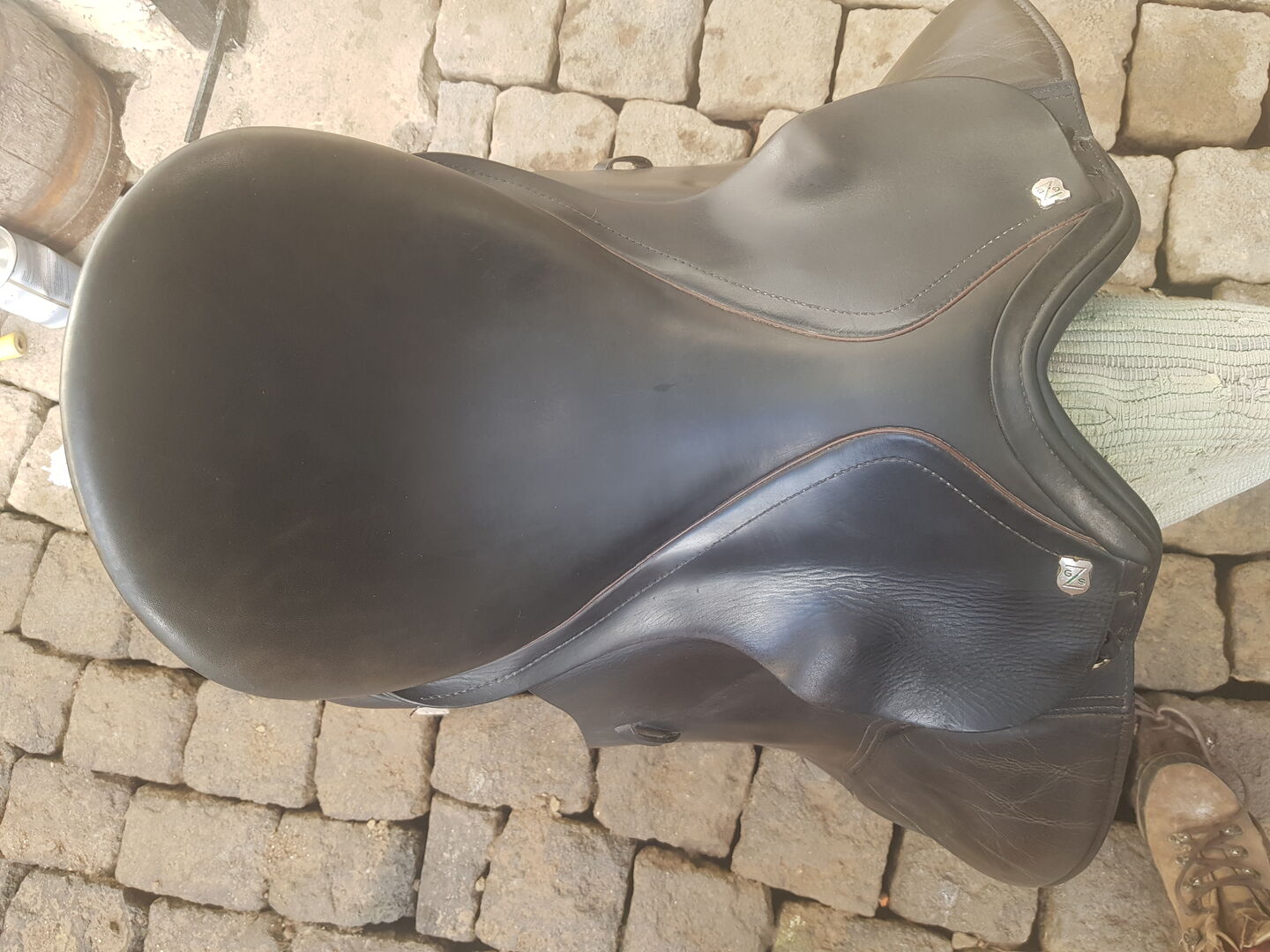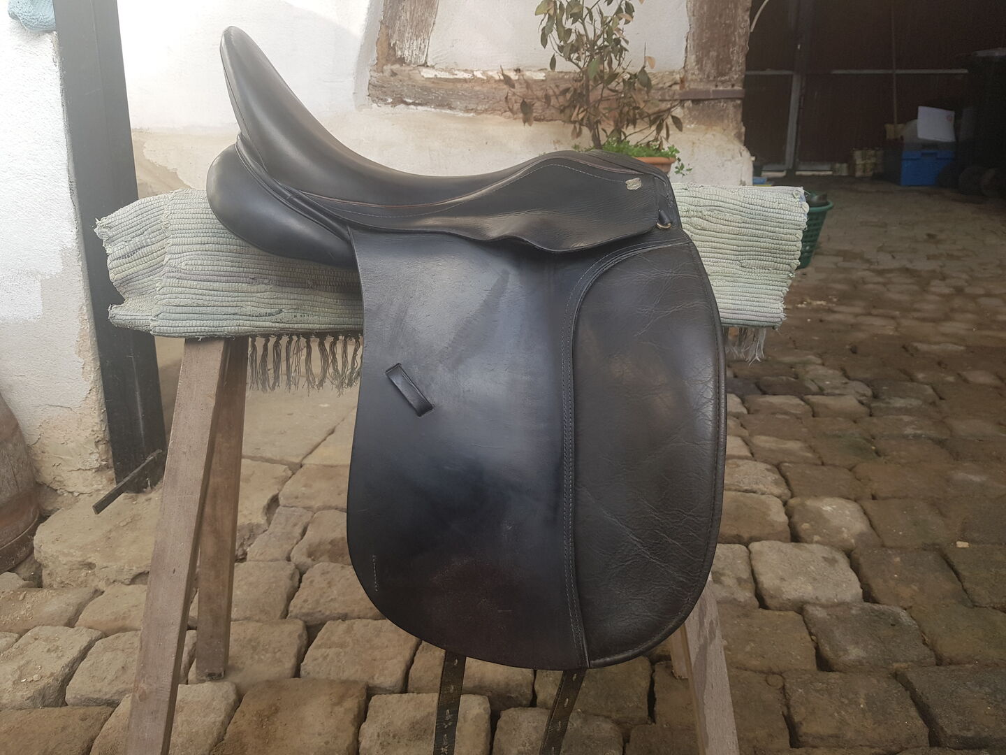 Het is een Massimo Dressage II zadel met Franse panelen, een 17,5 inch zit en een 38 gullet breedte.