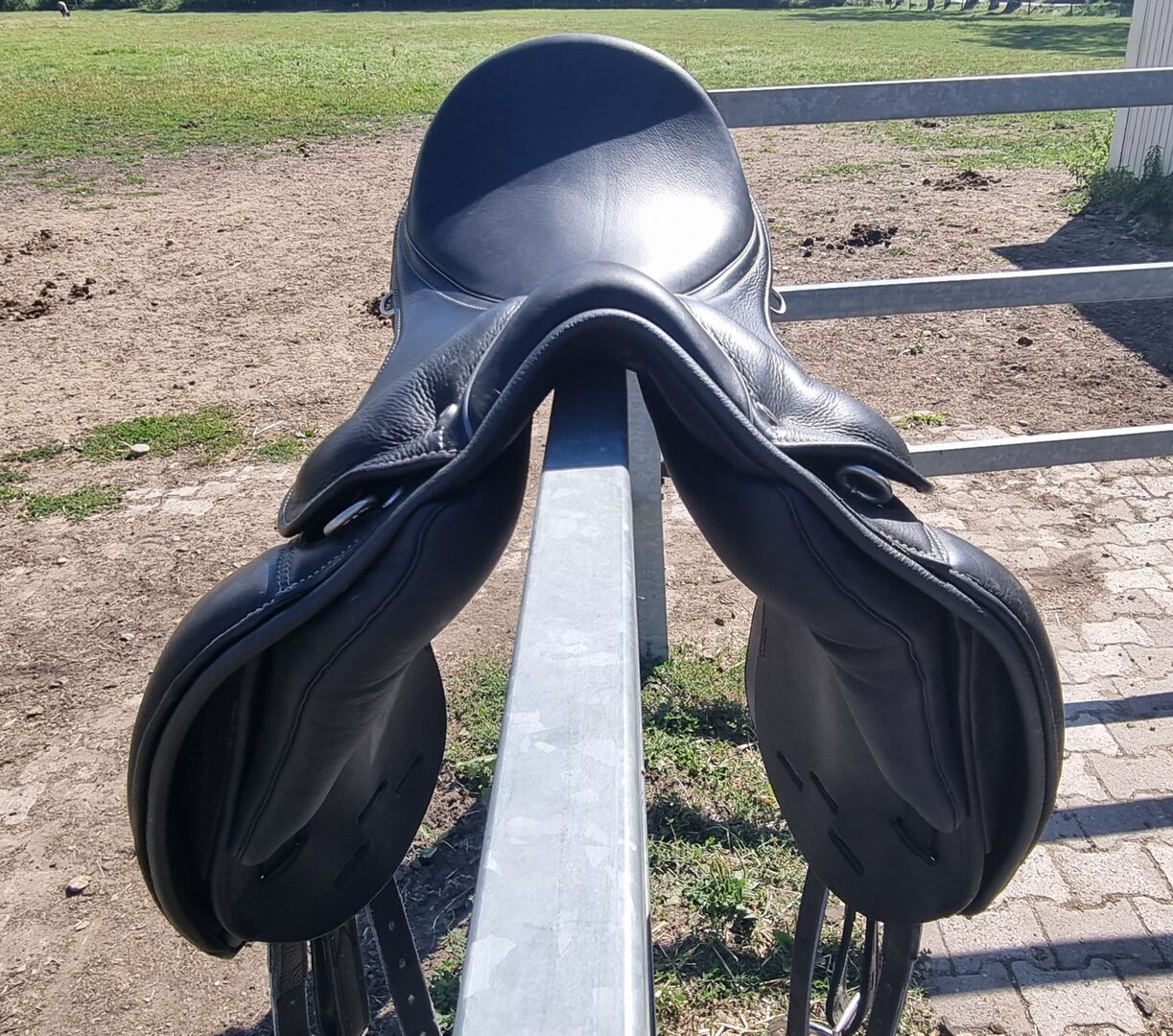 Zadel Vindur van PS / Dressuurzadel 17 inch - De Vindur van het merk PS is flexibel instelbaar met zijn verwisselbare slokdarm en opnieuw gevoerde panelen en is daardoor ook geschikt voor jonge paarden. Het heeft cut-back panelen voor optimale schoudervrijheid, zachte Franse panelen, individueel verstelbare klittenband panelen, een V singelbeschermer, ringen voor het bevestigen van een stijgbeugel leren singel en fietstassen. Het zadel, de pommels en de zadelkleppen zijn gemaakt van de hoogste kwaliteit, gedubbeld leer. Stijgbeugelriemen en stijgbeugels zijn in de prijs inbegrepen. Het zadel is minder dan een jaar oud en is niet erg intensief gebruikt, dus is bijna als nieuw.