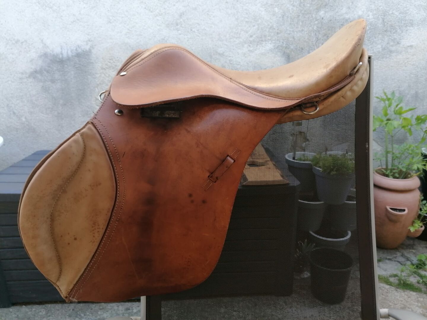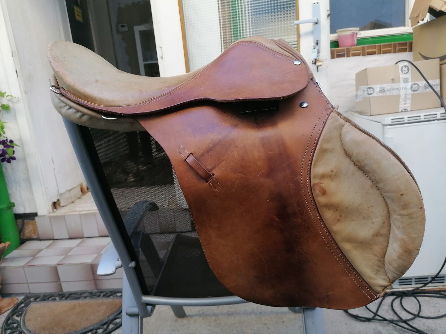 Zadel voor algemeen gebruik, echt leder - Forgiven Eventing zadel handgemaakt van echt kwaliteitsleer. Gebruikssporen, maar niet kapot, is altijd goed ingevet geweest. Zadeldoek en koperen stijgbeugels zijn inbegrepen.