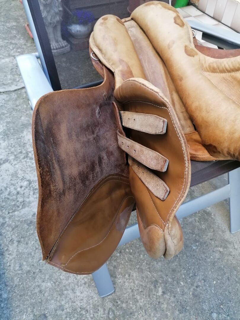 Zadel voor algemeen gebruik, echt leder - Forgiven Eventing zadel handgemaakt van echt kwaliteitsleer. Gebruikssporen, maar niet kapot, is altijd goed ingevet geweest. Zadeldoek en koperen stijgbeugels zijn inbegrepen.