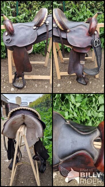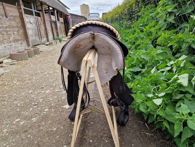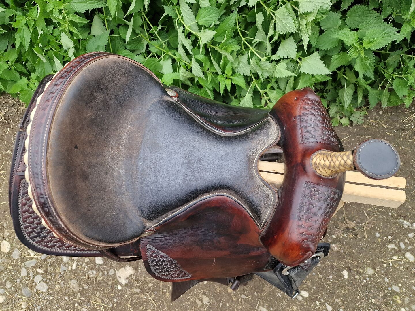 Gebruikt, goede staat. De vulling moet vernieuwd worden, het leer aan de binnenkant van de stijgbeugels heeft wat verzorging nodig. Ik heb het een keer ruw afgestoft. Droog en beschermd tegen weersinvloeden opgeslagen.