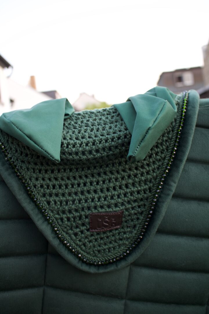 - Halster + touw met karabijnhaak - vliegenoren - Dressuur zadeldek - halster, vliegenoren en zadeldek met glanzende groene steentjes, Halster met zachte frontriem en neusriem - Sluitingen en karabijnhaken in donker messing