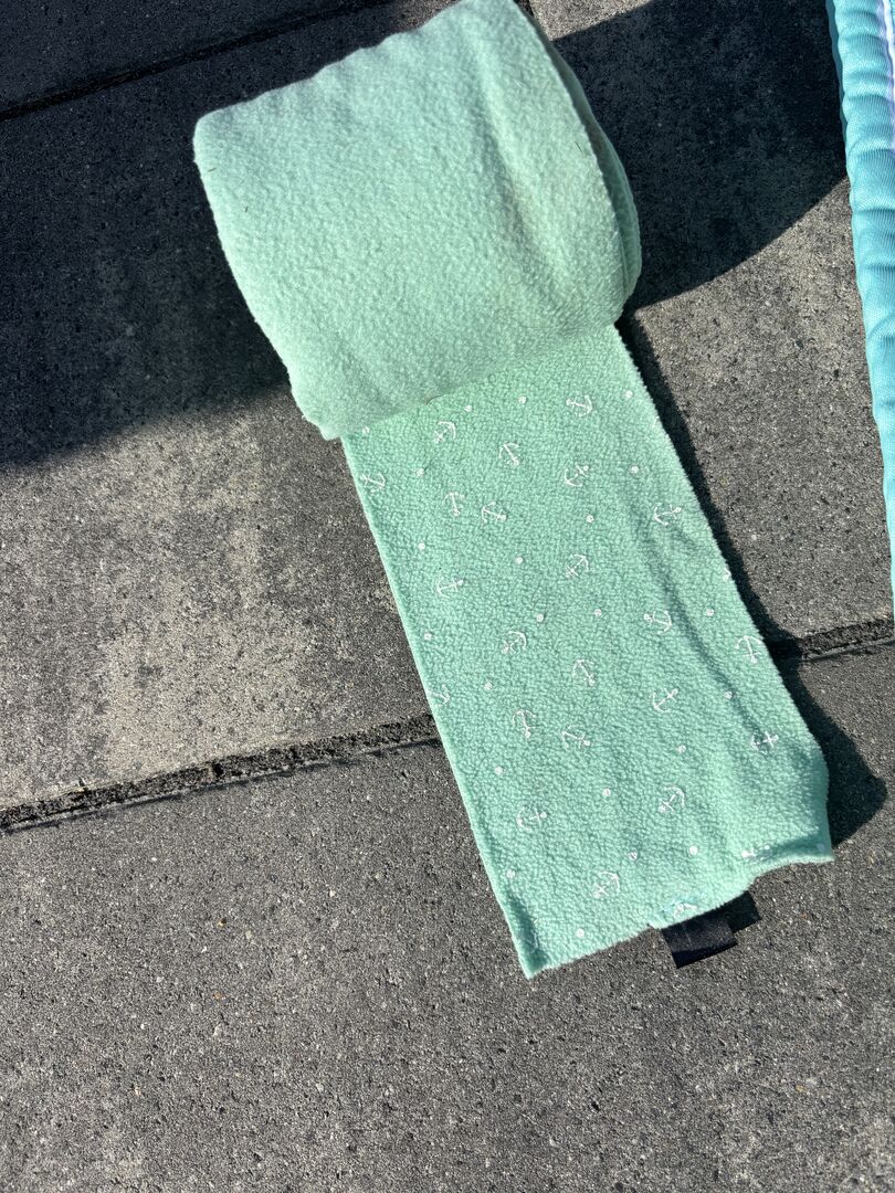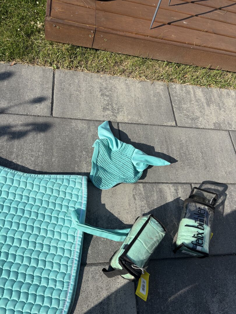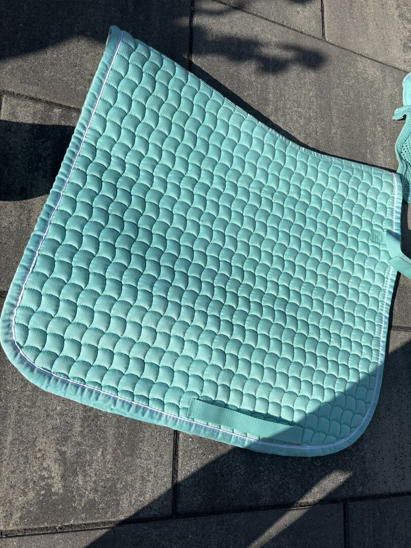Zadeldek als set - Ik verkoop deze set in dressuur warmbloed. Het bevat een zadeldek, vliegenmuts & 4 bandages met witte ankers. De set kan opnieuw gewassen worden voor de verkoop. De set is in goede staat.
