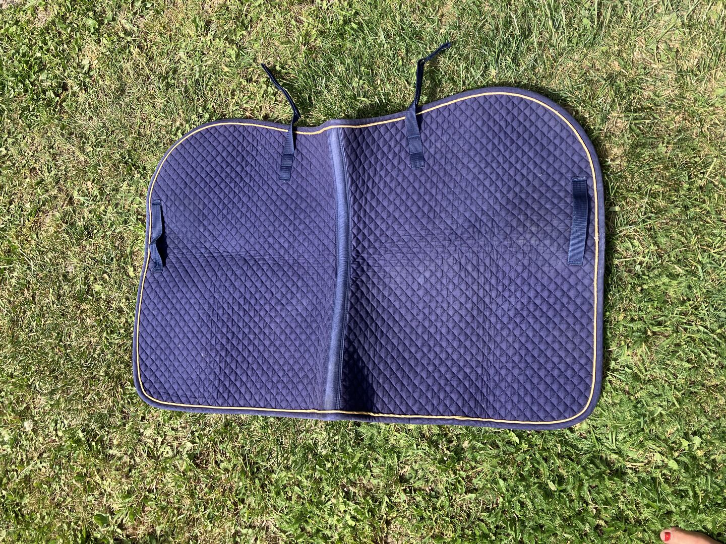 Zadeldek blauw met gouden rand - Ik bied hier een zadeldek aan in blauw met gouden rand Afmetingen: Ruglengte 58 cm Breedte van een zijde van het zadeldek 50 cm Particuliere verkoop-geen garantie-geen retournering