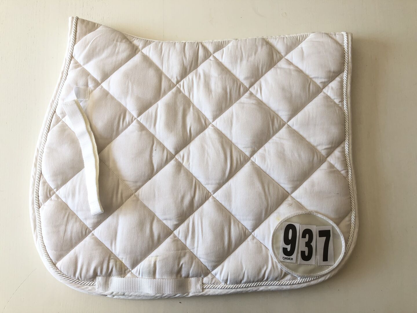 Zadeldek om weg te geven - Wit zadeldek met opgenaaide shownummers om weg te geven, want er zitten vlekken in het singelgedeelte, verder in goede staat