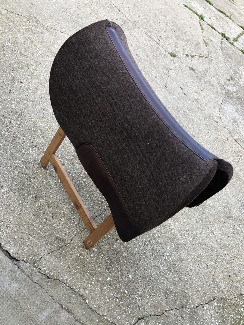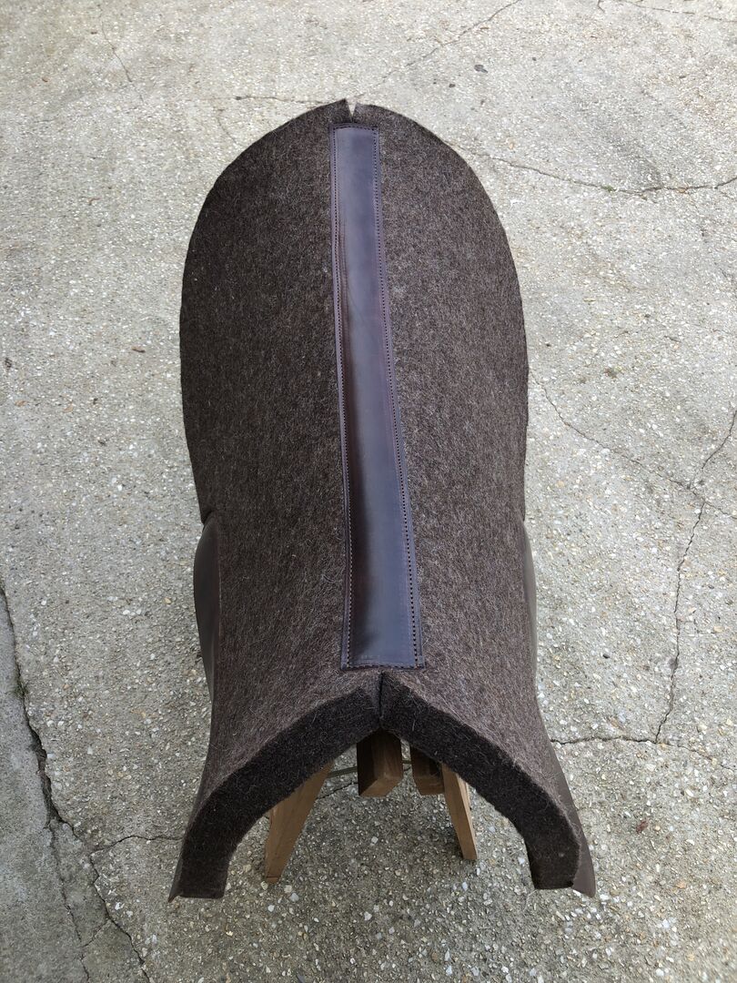 Anatomisch gevormd dekje van naturelkleurige, onbehandelde schapenwol met middennaad, teruggesneden bij de schoft, en bruine leren bies. Lengte 78 cm, dikte 20 mm.