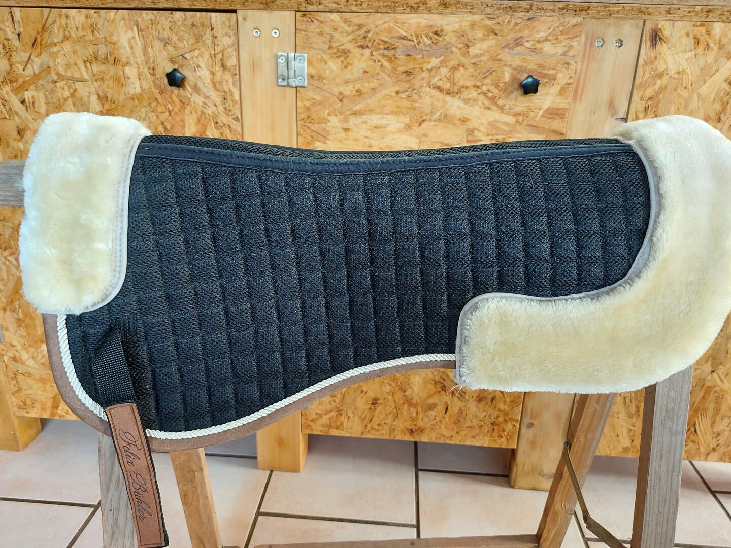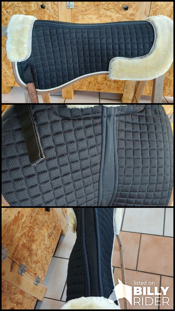 Zadeldekje - Verkoop van een zadelonderlegger van hoge kwaliteit, gemaakt van bijzonder ademend, wijdmazig spacer-weefsel, dat een constante luchtcirculatie mogelijk maakt. Zachte teddy fleece vulling op zadelrand en schoft. Ruglengte 47cm zonder bontrand