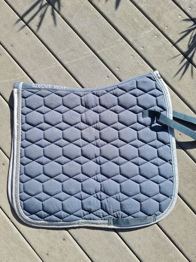Zadeldekje Dressuur Warmbloed - Aanbieding grijs dressuur zadeldek van HKM met glinsterende steentjes aan de rand. Is zelden gebruikt. Een paar haren gingen er niet uit, zelfs niet na het wassen. Verzendkosten hebben betrekking op verzekerde verzending. Onderhandse verkoop. Geen garantie en geen teruggave.