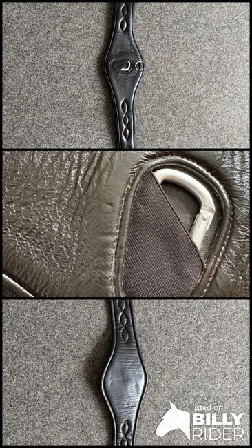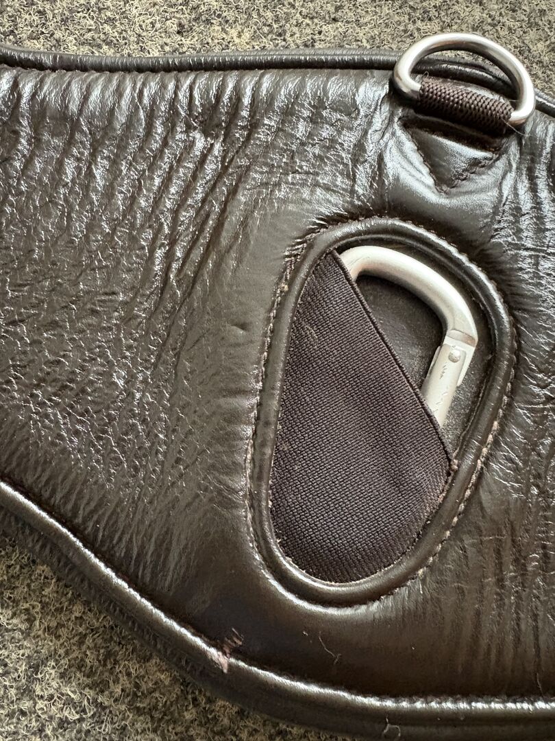 Zadelsingel 125 cm - Gebruikte zadelsingel in 125 cm. Grote karabijnhaak in het midden en kleine D-ringen aan de zijkant voor snelle bevestiging van hulpteugels.