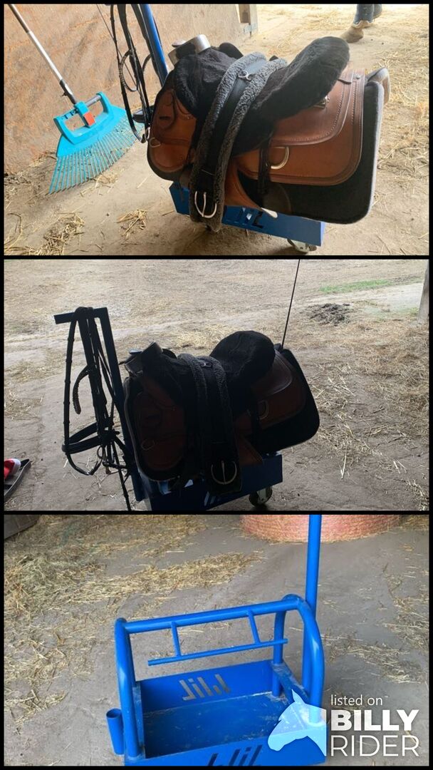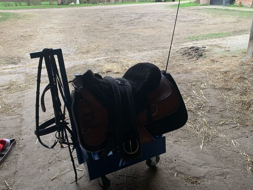 Zadelwagen - Ik heb deze trailer gekocht van iemand die hem zelf heeft gebouwd. Hij is gemaakt van stalen buizen en plaatstaal en is erg stevig. Ik gebruik hem voor mijn zware westernzadel, het hoofdstel en de krop, en er kunnen verschillende andere dingen in de "doos". Verzameling in Lübeck/Stockelsdorf.