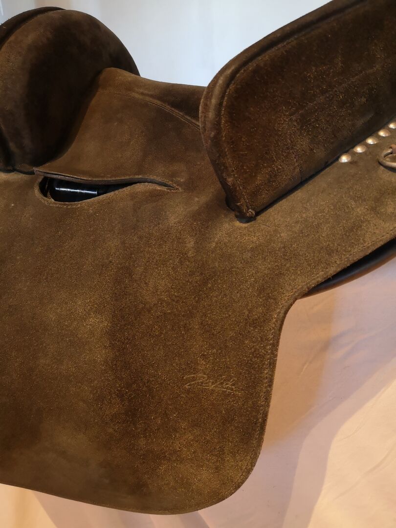 Zaldi Spaans Zadel - Bruin Spaans zadel, origineel Zaldi. Zeer goede, goed verzorgde staat, afmetingen: zie foto's. Hij is geschikt voor korte paardenruggen en heeft een brede kamer, ideaal voor volslanke pony's.