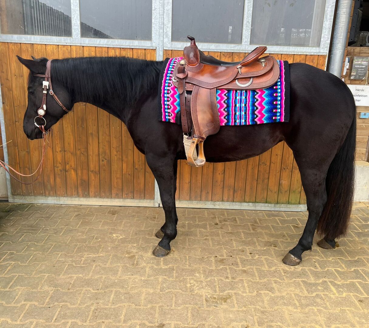 zeer mooie, zwarte Quarter Horse merrie - Deze zwarte schoonheid maakt niet alleen indruk met haar kleur, haar karakter is ook een droom. Ze is geboren in 2020 en heeft een lengte van ongeveer 150 cm. Abigail Hailey is een compacte, goed ontwikkelde merrie met een heerlijk karakter en goede gangen. Ze is erg braaf en ongecompliceerd. 6-panel n/n en gezond. Opgegroeid op het beste voer in grote weiden in een kudde. Kent hoefsmid en dierenarts. Abigail wordt momenteel voorzichtig ingereden en loopt, draaft en galoppeert. Onder het zadel is ze leergierig, getalenteerd en onproblematisch. Ze is ook gereden met Bosal. Abigail is Foundation gefokt (Hancock, Gossberry en Blue Valentine). Als u op zoek bent naar een mooie blikvanger voor wedstrijden en vrije tijd, moet u deze geweldige merrie eens bekijken.