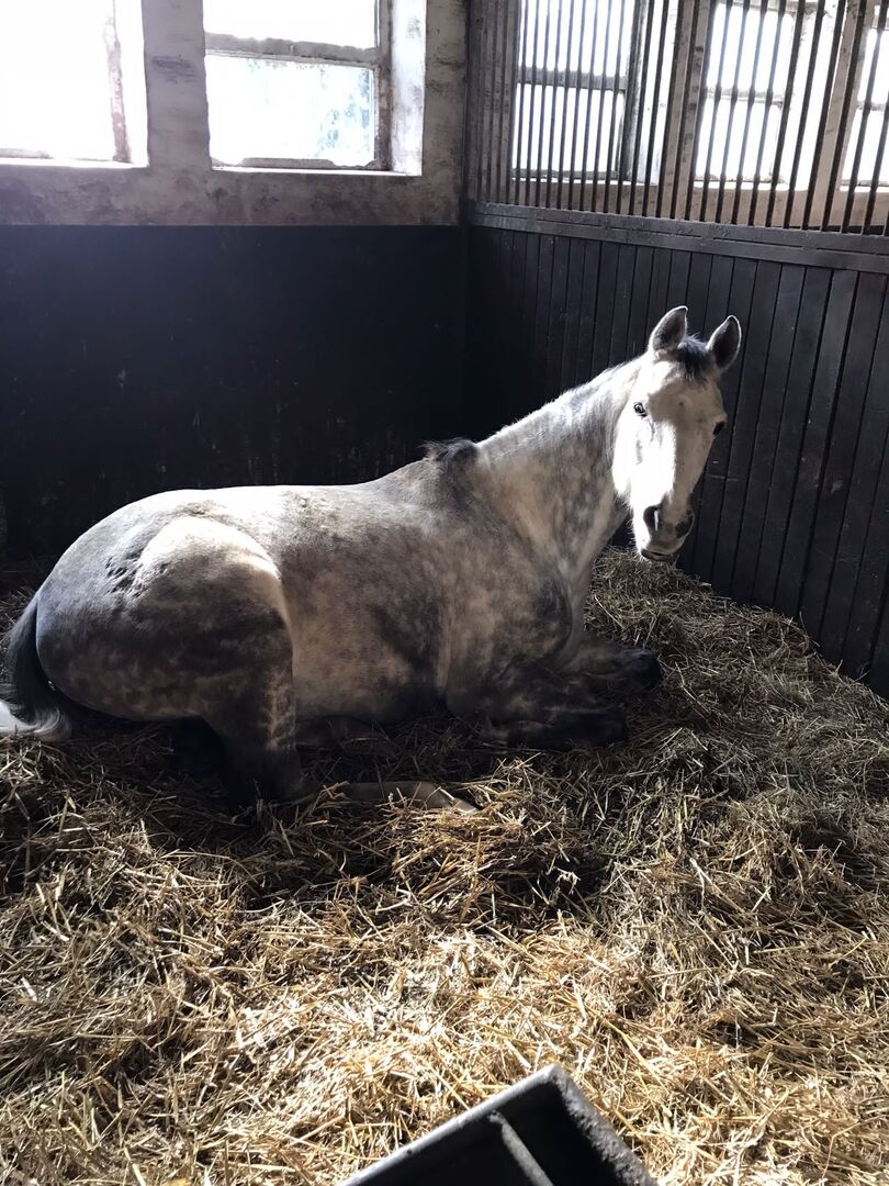 Door bevindingen aan hoef- en kniegewrichten is hij kreupel onder belasting en laat hij zijn ongemak duidelijk zien als hij klimt! Hij is NIET berijdbaar!!!