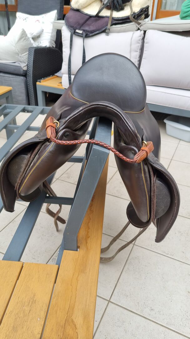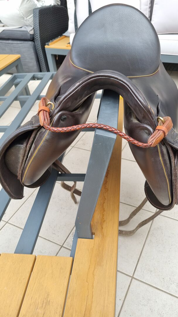 - gemaakt van voornamelijk bruin ruslandleer - met split in het blad - Kleur choco - stiksel mokka - beslag goud - halve maan montana cognac - bies goud - met bijpassende stijgbeugelriemen (bruin/goud)