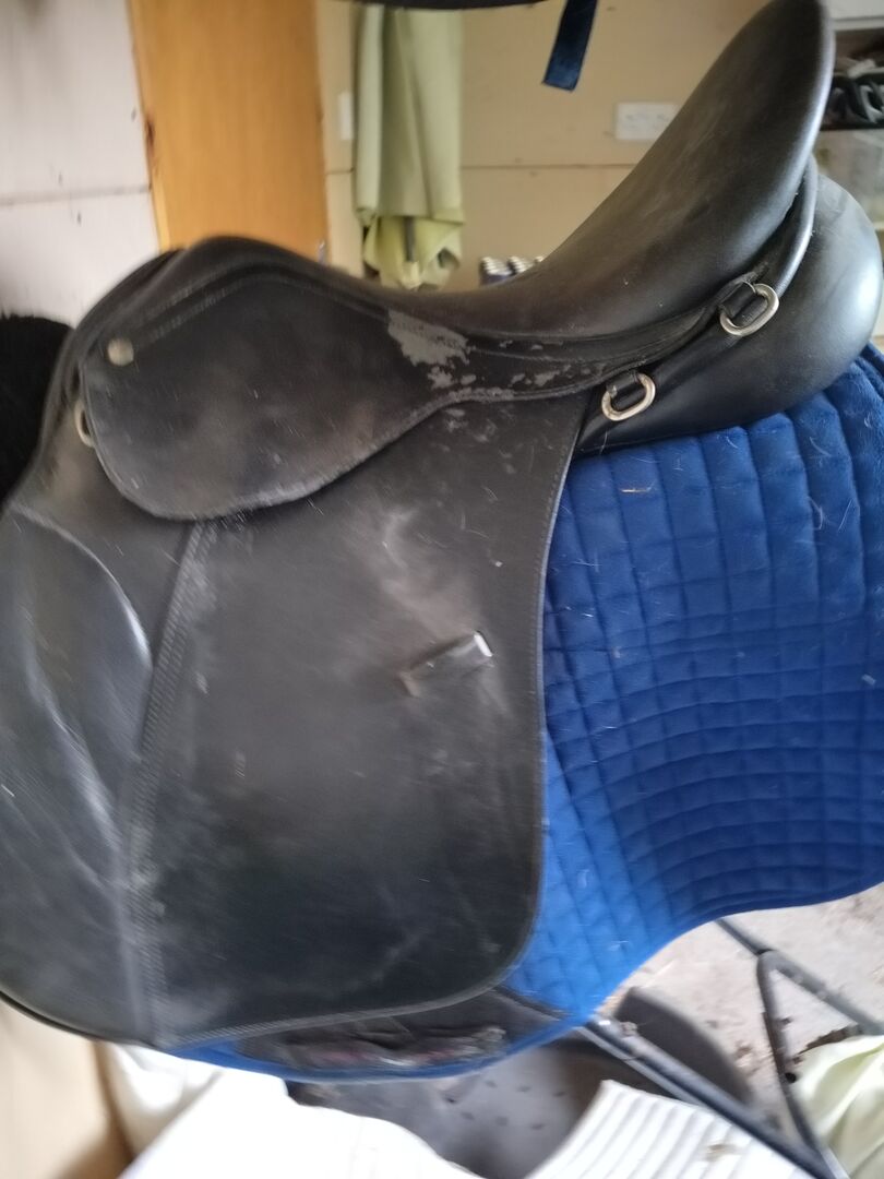 Black all leather saddle 17.5 inch seat. Extremely comfortable wide saddle. Stil well flocked. Used on 14.2 pony and cob. Some water damage to seat. Cosmetic only and all straps working perfectly (does not include girth or stirrups) can sell girth for extra