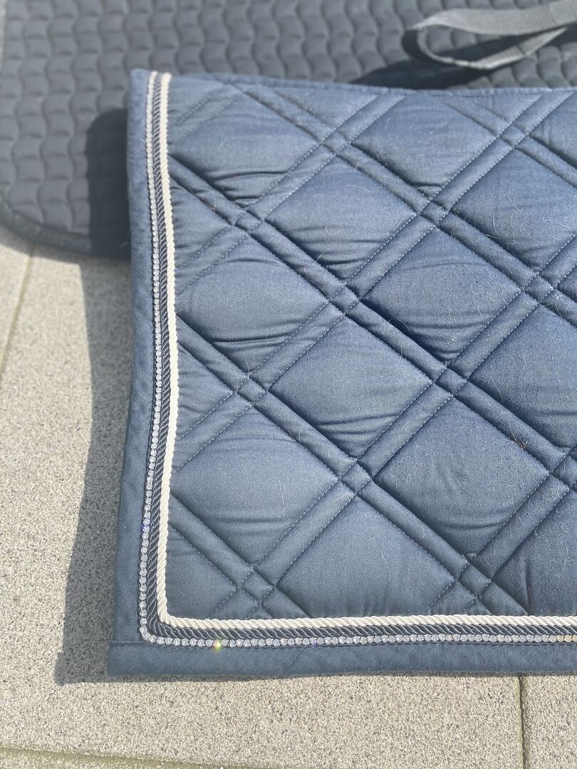 Alle steentjes op het blauwe Cheval de luxe zadeldek zitten er nog aan en is maat Vs.