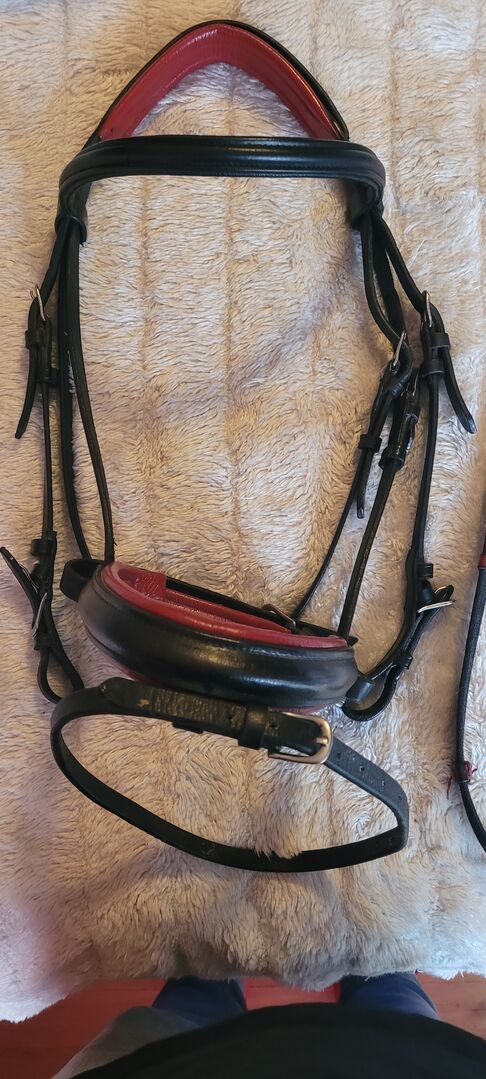 Zweedse neusriem maat COB met teugels - Ik bied een gebruikte zweedse neusriem (leer) maat COB zwart/rood aan met bijpassende teugels en een enkele gebroken D-ring snaffle van roestvrij staal met koperen rollers 12,5cm van het merk DMS, plus een losse frontriem en engelse neusriem (niet compleet).